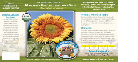 Azure Husbandry Mammoth Russian Sunflower Seed, Organic