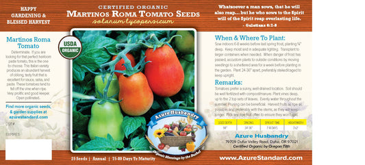 Azure Husbandry Martinos Roma Tomato Seed, Organic