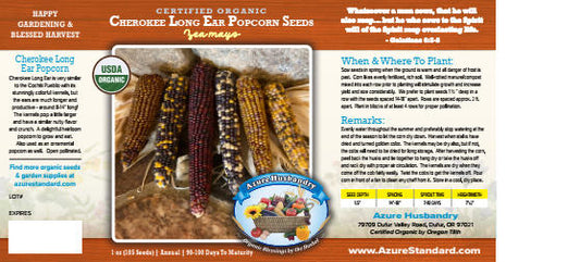 Azure Husbandry Cherokee Long Ear Popcorn Seed, Organic